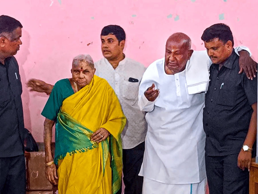 ಹಾಸನ : ಮಾಜಿ ಪ್ರಧಾನಿ ಎಚ್.ಡಿ.ದೇವೇಗೌಡ ಅವರು ಪತ್ನಿ ಚೆನ್ನಮ್ಮ ಅವರೊಂದಿಗೆ ಹೆಲಿಕಾಪ್ಟರ್ನಲ್ಲಿ ಬಂದು ಮತ ಚಲಾಯಿಸಿದ್ದಾರೆ.